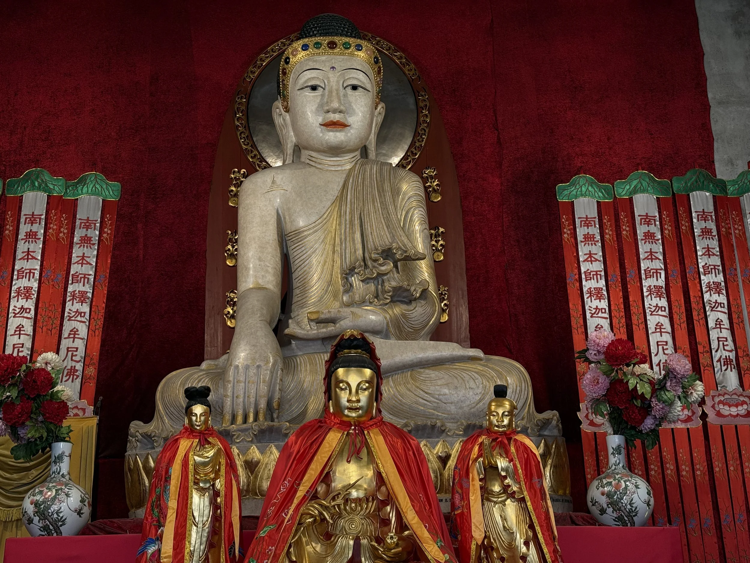 รูปปั้นศักดิ์สิทธิ์: ภายในวัดมีรูปปั้นสำคัญหลายองค์ อาทิ พระพุทธรูปหยกที่ใหญ่ที่สุดในจีน (ในท่านั่ง สูง 3.8 เมตร) และ พระพุทธรูปเงินองค์ใหญ่ น้ำหนักกว่า 15 ตัน ภายในโถงหลัก (Mahavira Hall)